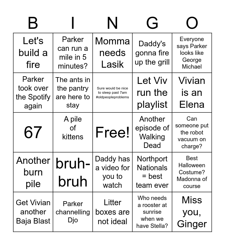 This bingo card has a free space and 33 words: Viv coming in 3rd overall for Chocolocco, Daddy is ready to become a plumber, A pile of kittens, What happened to Chuck's face now?, Another burn pile, The ants in the pantry are here to stay, Everyone says Parker looks like George Michael, Get Vivian another Baja Blast, Parker can run a mile in 5 minutes?, No more Ghosts for Vivian, Sure would be nice to sleep past 7am #oldpeopleproblems, Momma needs Lasik, Can we just live off Poppy's mac & cheese?, Mr. Black & Mr. Orange, Another episode of Walking Dead, Vivian is an Elena, Parker channelling Djo, 67, bruh-bruh, Northport Nationals = best team ever, Daddy has a video for you to watch, Seriously, have you checked your chore list?, Let's build a fire, Can someone put the robot vacuum on charge?, Litter boxes are not ideal, Miss you, Ginger, Daddy's gonna fire up the grill, Let Viv run the playlist, Parker took over the Spotify again, Best Halloween Costume? Madonna of course, 13 boys at a pool party? No problem, Who needs a rooster at sunrise when we have Stella? and We need a basement intercom system.