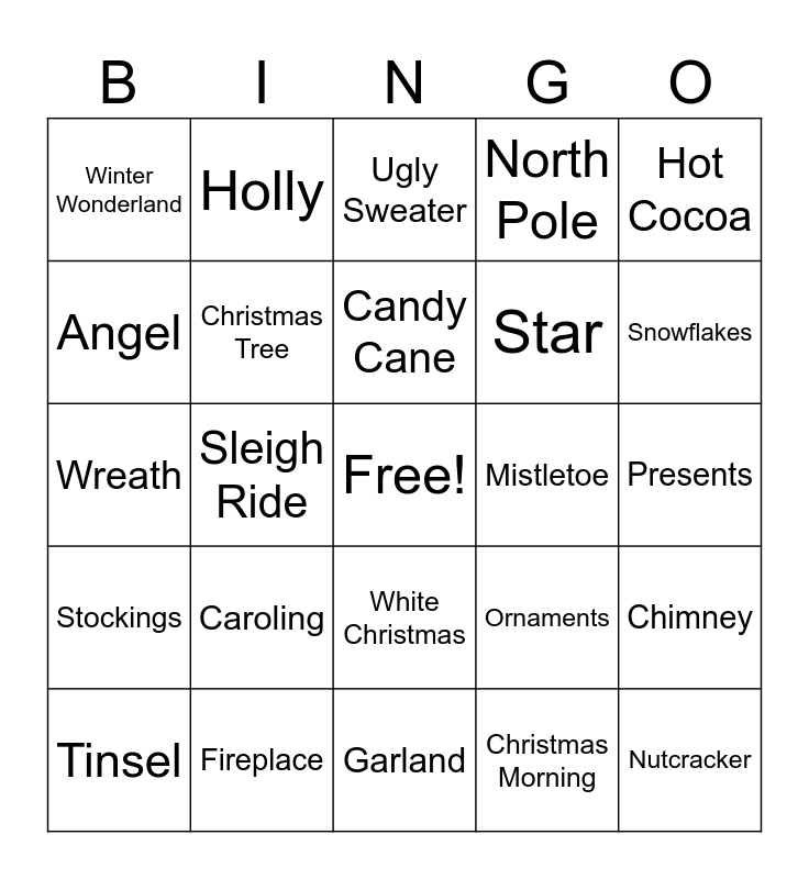 This bingo card has a free space and 36 words: Santa Claus, Reindeer, Snowman, Christmas Tree, Ornaments, Stockings, Candy Cane, Gingerbread, Hot Cocoa, Jingle Bells, Sleigh Ride, North Pole, Elf, Mistletoe, Snowflakes, Winter Wonderland, Christmas Lights, Caroling, Nutcracker, Ugly Sweater, Presents, Chimney, Fireplace, Tinsel, Garland, Holly, Wreath, Bells, Star, Angel, Silent Night, Christmas Eve, Christmas Morning, White Christmas, Deck the Halls and Joy to the World.