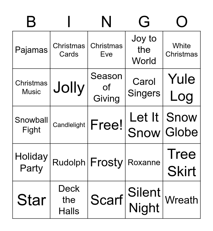 This bingo card has a free space and 43 words: Holly, Wreath, Bells, Star, Angel, Silent Night, Christmas Eve, Christmas Morning, White Christmas, Deck the Halls, Joy to the World, Let It Snow, Frosty, Rudolph, Sleigh Bells, Scarf, Mittens, Snowball Fight, Ice Skating, Yule Log, Christmas Cards, Family Gathering, Holiday Cheer, Pajamas, Gift Exchange, Snow Globe, Peppermint, Sugar Cookies, Roxanne, Holiday Party, Christmas Parade, Tree Skirt, Poinsettia, Candlelight, Evergreen, Snow, Festive, Season of Giving, Christmas Music, Carol Singers, Holiday Spirit, Jolly and Santa Hat.