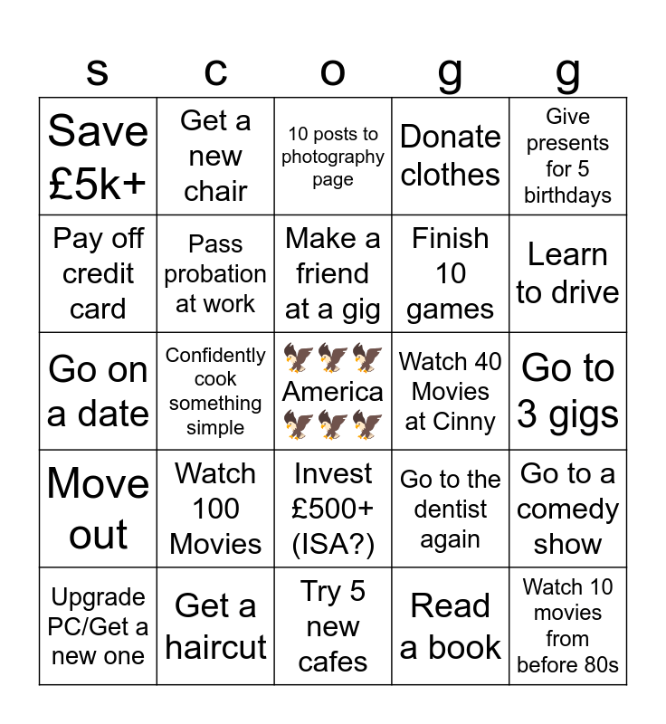 This bingo card has a free space and 24 words: Watch 100 Movies, Get a haircut, Make a friend at a gig, Upgrade PC/Get a new one, Give presents for 5 birthdays, Save £5k+, Pay off credit card, Get a new chair, Watch 40 Movies at Cinny, Invest £500+ (ISA?), Finish 10 games, Go on a date, Go to the dentist again, Go to a comedy show, Pass probation at work, Read a book, Go to 3 gigs, 10 posts to photography page, Learn to drive, Confidently cook something simple, Watch 10 movies from before 80s, Move out, Donate clothes and Try 5 new cafes.