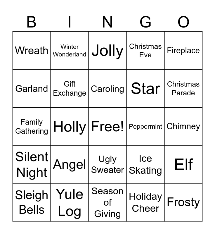 This bingo card has a free space and 65 words: Jingle Bells, Sleigh Ride, North Pole, Elf, Mistletoe, Snowflakes, Winter Wonderland, Christmas Lights, Caroling, Nutcracker, Ugly Sweater, Presents, Chimney, Fireplace, Tinsel, Garland, Holly, Wreath, Bells, Star, Angel, Silent Night, Christmas Eve, Christmas Morning, White Christmas, Deck the Halls, Joy to the World, Let It Snow, Frosty, Rudolph, Sleigh Bells, Scarf, Mittens, Snowball Fight, Ice Skating, Yule Log, Christmas Cards, Family Gathering, Holiday Cheer, Pajamas, Gift Exchange, Snow Globe, Peppermint, Sugar Cookies, Roxanne, Holiday Party, Christmas Parade, Tree Skirt, Poinsettia, Candlelight, Evergreen, Snow, Festive, Season of Giving, Christmas Music, Carol Singers, Holiday Spirit, Jolly, Santa Hat, Snow Angel, Christmas Dinner, Candy, Ribbon, Bow and Gift Tags.
