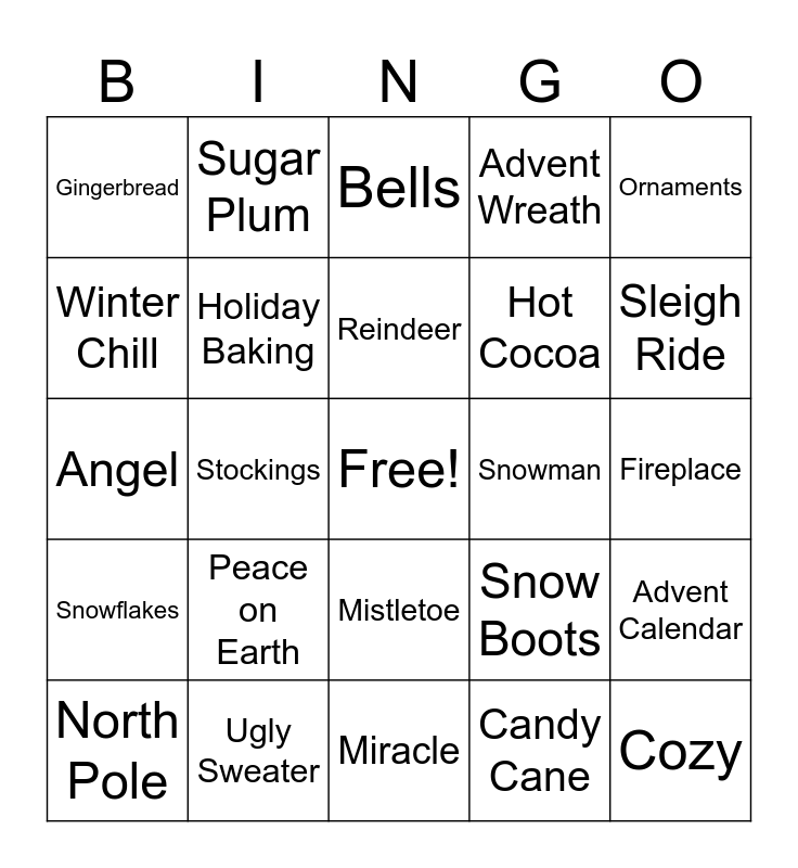 This bingo card has a free space and 48 words: Warm Blankets, Cozy, Holiday Movies, Miracle, Peace on Earth, Goodwill, Sugar Plum, Snowstorm, Winter Chill, Midnight Mass, Holiday Baking, Advent Wreath, Advent Calendar, Snow Boots, Noel, Santa Claus, Reindeer, Snowman, Christmas Tree, Ornaments, Stockings, Candy Cane, Gingerbread, Hot Cocoa, Jingle Bells, Sleigh Ride, North Pole, Elf, Mistletoe, Snowflakes, Winter Wonderland, Christmas Lights, Caroling, Nutcracker, Ugly Sweater, Presents, Chimney, Fireplace, Tinsel, Garland, Holly, Wreath, Bells, Star, Angel, Silent Night, Christmas Eve and Christmas Morning.