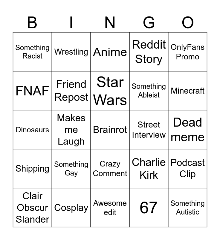 This bingo card has 25 words: Something Gay, Awesome edit, Star Wars, Clair Obscur Slander, OnlyFans Promo, Something Racist, FNAF, Wrestling, Street Interview, Crazy Comment, Something Ableist, Dinosaurs, Charlie Kirk, Podcast Clip, Friend Repost, Something Autistic, Dead meme, Anime, Minecraft, Makes me Laugh, Brainrot, Cosplay, Shipping, Reddit Story and 67.