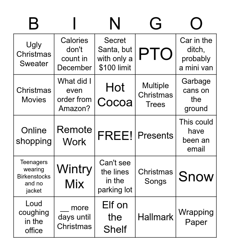 This bingo card has a free space and 24 words: Wintry Mix, __ more days until Christmas, Hot Cocoa, Loud coughing in the office, Car in the ditch, probably a mini van, Ugly Christmas Sweater, Christmas Movies, Calories don't count in December, Presents, Can't see the lines in the parking lot, Multiple Christmas Trees, Online shopping, Christmas Songs, Snow, What did I even order from Amazon?, Hallmark, This could have been an email, Secret Santa, but with only a $100 limit, Garbage cans on the ground, Remote Work, Wrapping Paper, Teenagers wearing Birkenstocks and no jacket, PTO and Elf on the Shelf.