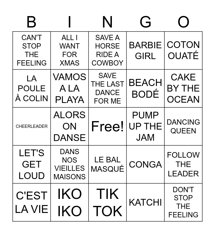This bingo card has a free space and 72 words: 23 DÉCEMBRE., ALL I WANT FOR XMAS, ALORS ON DANSE, BABY, BABY SHARK, BANG BANG, BARBIE GIRL, FIREBALL, BEACH BODÉ, BLUE (DA BA DEE), C'EST LA VIE, ÇA FAIT RIRE LES OISEAUX, CAKE BY THE OCEAN, CAN'T STOP THE FEELING, CHAISE MUSICALE, CHEERLEADER, CONGA, COTON OUATÉ, COTTON EYE JOE, DANCING QUEEN, DANS NOS VIEILLES MAISONS, DON'T STOP THE FEELING, FOLLOW THE LEADER, FOOTLOSE, GIRL JUST WANT TO HAVE FUN, HIPS DON'T LIE, HONEY, I'M GOOD, I GOTTA FEELING, I LOVE IT, I WANNA DANCE, IKO IKO, J'IRAI OU TU IRAS, JIGGLE JIGGLE, JUMP AROUND, KATCHI, LA BONNE FRANQUETTE, LA CUISINIÈRE, LA DANSE DES CANARDS, LA POULE À COLIN, LA ZIGUEZON, LE BAL MASQUÉ, LE PÈRE NOËL ARRIVE CE SOIR, LE PÈRE NOËL C'T'UN QUÉBÉCOIS, LE REMÈDE MIRACLE, LES POUCES EN AVANT (TCHIC ET TCHAC HAN HAN), LET'S GET LOUD, LOW, MACARENA, MAMBO NO 5, MAN!I FEEL LIKE A WOMAN, METTRE DU TAPE SUR MA PALETTE, NEVER GONNA GIVE YOU UP, SODA POP, PUMP UP THE JAM, RIVERS OF BABYLON, S&M, SAVE A HORSE RIDE A COWBOY, SAVE THE LAST DANCE FOR ME, SHAKE IT OFF, SHUT UP AND DANCE, TEXAS HOLD'EM, SUAVEMENTE, THUNDERSTRUCK, TIK TOK, TWIST N SHOUT, UPTOWN FUNK, VAMOS A LA PLAYA, WAKE ME UP, WAKE ME UP BEFORE YOU GOGO, WANNABE, WATCH ME and Y.M.C.A.