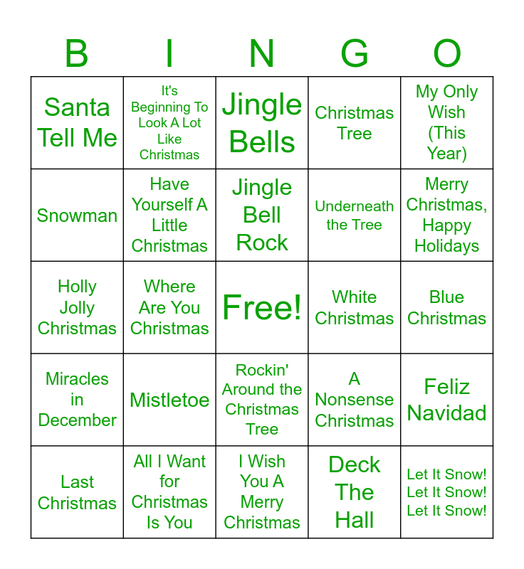 This bingo card has a free space and 24 words: Mistletoe, All I Want for Christmas Is You, Jingle Bell Rock, Last Christmas, My Only Wish (This Year), Santa Tell Me, Snowman, It's Beginning To Look A Lot Like Christmas, White Christmas, Rockin' Around the Christmas Tree, Underneath the Tree, Holly Jolly Christmas, A Nonsense Christmas, Feliz Navidad, Have Yourself A Little Christmas, Deck The Hall, Blue Christmas, Jingle Bells, Merry Christmas, Happy Holidays, Where Are You Christmas, Let It Snow! Let It Snow! Let It Snow!, Miracles in December, Christmas Tree and I Wish You A Merry Christmas.