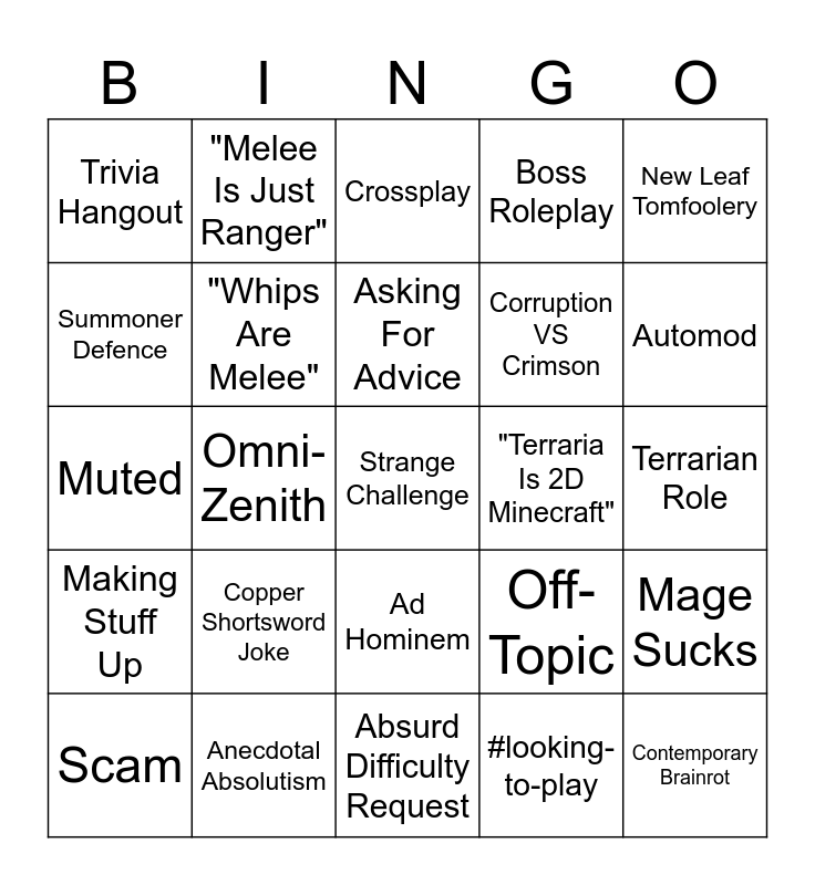 This bingo card has 25 words: Copper Shortsword Joke, Absurd Difficulty Request, Asking For Advice, Scam, New Leaf Tomfoolery, Trivia Hangout, Summoner Defence, "Melee Is Just Ranger", "Terraria Is 2D Minecraft", Ad Hominem, Corruption VS Crimson, Muted, Off-Topic, Mage Sucks, "Whips Are Melee", Contemporary Brainrot, Terrarian Role, Crossplay, Automod, Omni-Zenith, Strange Challenge, Anecdotal Absolutism, Making Stuff Up, Boss Roleplay and #looking-to-play.