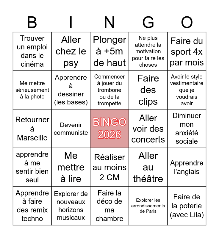 This bingo card has a free space and 24 words: Me mettre à lire, Explorer de nouveaux horizons musicaux, Commencer à jouer du trombone ou de la trompette, Apprendre à faire des remix techno, Faire du sport 4x par mois, Trouver un emploi dans le cinéma, Me mettre sérieusement à la photo, Aller chez le psy, Aller voir des concerts, Réaliser au moins 2 CM, Faire des clips, Retourner à Marseille, Aller au théâtre, Apprendre l'anglais, Apprendre à dessiner (les bases), Explorer les arrondissements de Paris, Diminuer mon anxiété sociale, Plonger à +5m de haut, Avoir le style vestimentaire que je voudrais avoir, Devenir communiste, Faire de la poterie (avec Lila), apprendre à me sentir bien seul, Ne plus attendre la motivation pour faire les choses and Faire la déco de ma chambre.