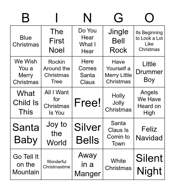 This bingo card has a free space and 50 words: Jingle Bells, Silent Night, O Holy Night, Away in a Manger, Joy to the World, Hark The Herald Angels Sing, The First Noel, O Come All Ye Faithful, We Wish You a Merry Christmas, Deck the Halls, Rockin Around the Christmas Tree, Jingle Bell Rock, Feliz Navidad, Santa Claus Is Comin to Town, Rudolph the Red Nosed Reindeer, Frosty the Snowman, Here Comes Santa Claus, Holly Jolly Christmas, Let It Snow, Its Beginning to Look a Lot Like Christmas, All I Want for Christmas Is You, White Christmas, Blue Christmas, Have Yourself a Merry Little Christmas, Sleigh Ride, Winter Wonderland, Little Drummer Boy, Carol of the Bells, Do You Hear What I Hear, Silver Bells, Grandma Got Run Over by a Reindeer, Youre a Mean One Mr Grinch, Christmas Baby Please Come Home, Last Christmas, Wonderful Christmastime, Run Run Rudolph, Merry Christmas Darling, Ill Be Home for Christmas, God Rest Ye Merry Gentlemen, Angels We Have Heard on High, Little Saint Nick, The Christmas Song Chestnuts Roasting, Happy Xmas War Is Over, This Christmas, Go Tell It on the Mountain, What Child Is This, Up on the Housetop, O Come O Come Emmanuel, Santa Baby and Do They Know Its Christmas.