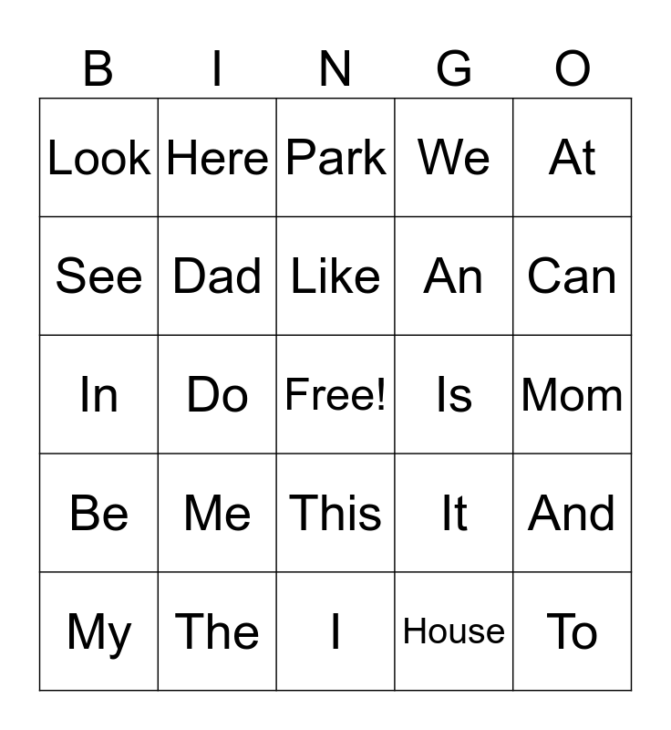 This bingo card has a free space and 24 words: Me, The, Like, My, At, Look, See, Here, Is, This, An, In, It, And, Dad, House, Mom, Park, Can, Do, To, Be, We and I.