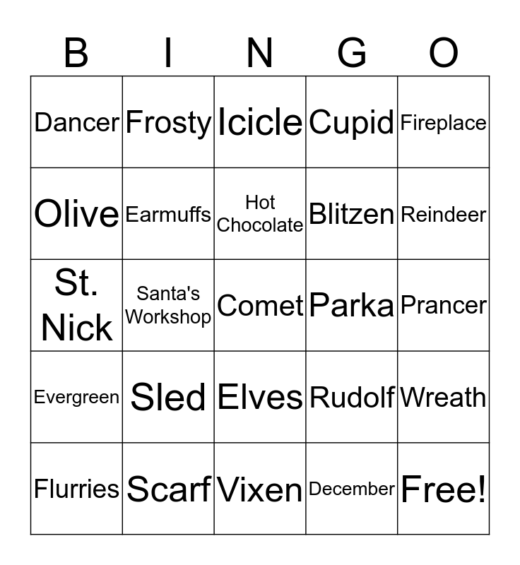 This bingo card has 34 words: Free!, December, Cold, Eggnog, Evergreen, Earmuffs, Fireplace, Flurries, Frosty, Gingerbread, Hot Chocolate, Icicle, Log, Mittens, Parka, Reindeer, Scarf, St. Nick, Sled, Rudolf, Elves, Dasher, Dancer, Prancer, Vixen, Comet, Cupid, Donner, Blitzen, Olive, Mrs. Claus, Santa's Workshop, Wreath and Christmas Tree.