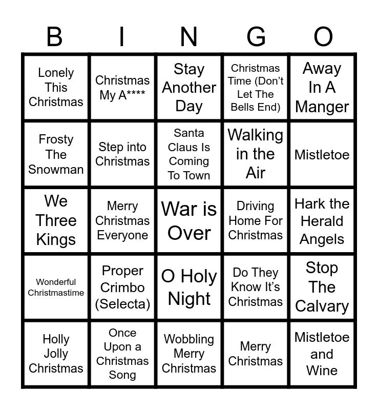 This bingo card has 35 words: Free!, Last Christmas, One More Sleep, Step into Christmas, O Holy Night, Christmas Time (Don’t Let The Bells End), Frosty The Snowman, I Saw Mommy Kissing Santa Claus, Santa Claus Is Coming To Town, Rudolph The Red-Nosed Reindeer, We Three Kings, Away In A Manger, 2000 Miles, Blue Christmas, Lonely This Christmas, Driving Home For Christmas, Merry Christmas, Merry Christmas Everyone, Wonderful Christmastime, War is Over, Do They Know It’s Christmas, Holly Jolly Christmas, Stop The Calvary, Once Upon a Christmas Song, Stay Another Day, Mistletoe, Mistletoe and Wine, Saviour’s Day, Walking in the Air, Hark the Herald Angels, Joy To The World, Wobbling Merry Christmas, Proper Crimbo (Selecta), Christmas My A**** and We Wish You a Merry Christmas.