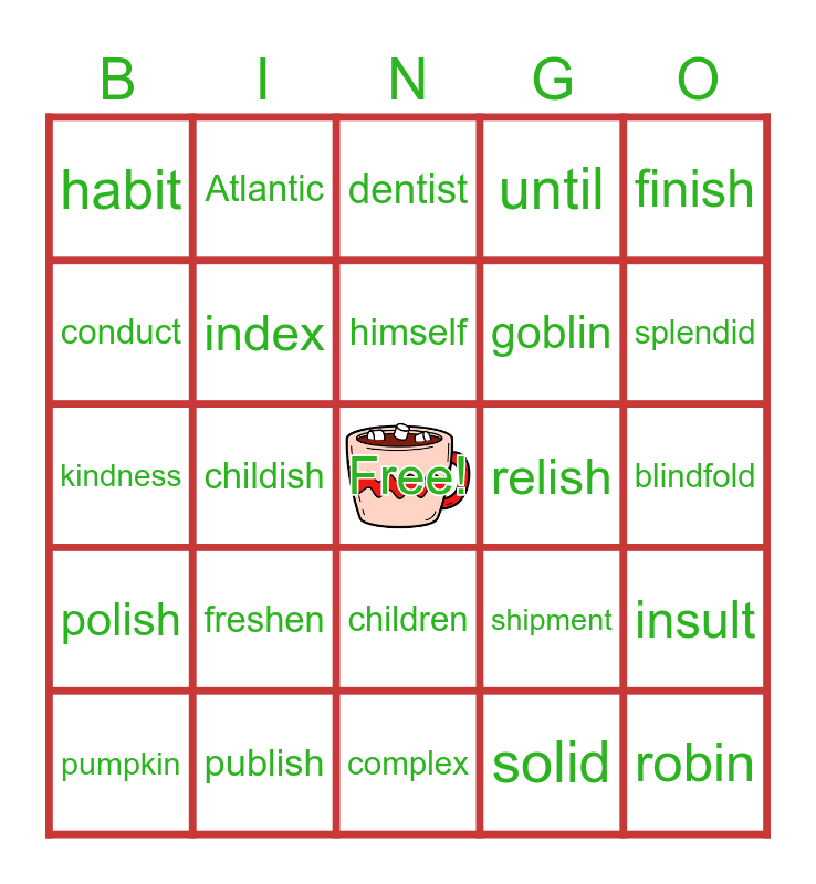 This bingo card has a free space and 58 words: upset, publish, limit, polish, solid, cabin, index, edit, goblin, combat, until, punish, exit, napkin, chipmunk, habit, robin, finish, slingshot, himself, relish, dentist, pumpkin, insult, invent, blindfold, disrupt, insist, splendid, static, clinic, panic, public, frantic, fantastic, fabric, selfish, childish, kindness, thankless, freshen, handful, shipment, investment, sadness, fixable, unselfish, children, complex, unkind, nonstop, inhabit, magnetic, volcanic, Atlantic, infect, conduct and credit.