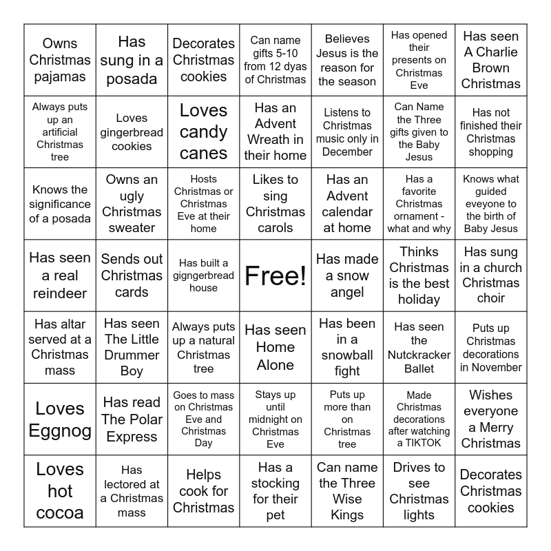 This bingo card has a free space and 55 words: Loves Eggnog, Has read The Polar Express, Can name all of Santa's Reindeer, Can name gifts 5-10 from 12 dyas of Christmas, Listens to Christmas music only in December, Made Christmas decorations after watching a TIKTOK, Has not finished their Christmas shopping, Has been in a Nativity play, Has sung in a posada, Goes to mass on Christmas Eve and Christmas Day, Has an Advent Wreath in their home, Has been in a snowball fight, Thinks Christmas is the best holiday, Puts up Christmas decorations in November, Has altar served at a Christmas mass, Has lectored at a Christmas mass, Loves candy canes, Likes to sing Christmas carols, Can name the Three Wise Kings, Can Name the Three gifts given to the Baby Jesus, Knows what guided eveyone to the birth of Baby Jesus, Knows the significance of a posada, Has seen The Little Drummer Boy, Decorates Christmas cookies, Has had a white Christmas, Has opened their presents on Christmas Eve, Has sung in a church Christmas choir, Loves hot cocoa, Sends out Christmas cards, Hosts Christmas or Christmas Eve at their home, Has made a snowman, Has made a snow angel, Drives to see Christmas lights, Decorates Christmas cookies, Owns Christmas pajamas, Owns an ugly Christmas sweater, Always puts up a natural Christmas tree, Has a stocking for their pet, Has an Advent calendar at home, Has seen the Nutckracker Ballet, Has seen A Charlie Brown Christmas, Has seen a real reindeer, Has a Nativity scene at home, Helps cook for Christmas, Has seen Home Alone, Believes Jesus is the reason for the season, Has outdoor Christmas Decorations, Wishes everyone a Merry Christmas, Always puts up an artificial Christmas tree, Loves gingerbread cookies, Has built a gigngerbread house, Stays up until midnight on Christmas Eve, Puts up more than on Christmas tree, Has a favorite Christmas ornament - what and why and Has a favorite Christmas tradition - what and why.