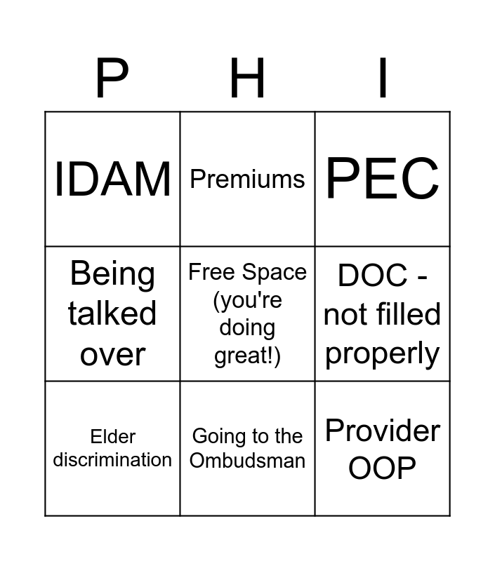 This bingo card has a free space and 10 words: Going to the Ombudsman, PEC, IDAM, Provider OOP, Being talked over, Elder discrimination, Premiums, No cover, DOC - not filled properly and Couple discrimination.