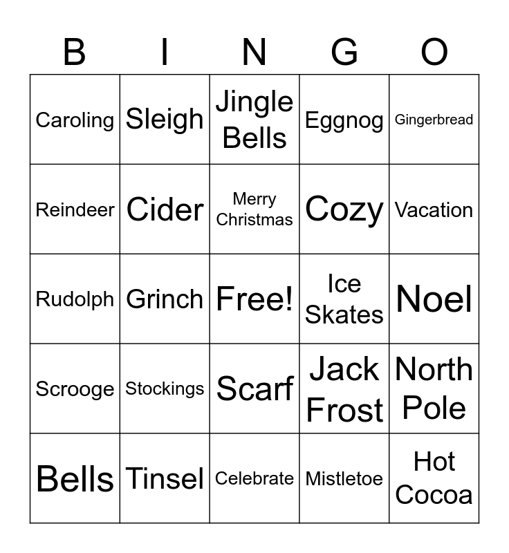 This bingo card has a free space and 55 words: Advent Calendar, Bells, Candy Cane, Caroling, Celebrate, Christmas Tree, Cider, Cookies, Cozy, December, Eggnog, Elves, Family, Festive, Frosty, Garland, Gingerbread, Grinch, Ho Ho Ho, Hot Cocoa, Ice Skates, Icicle, Jack Frost, Jingle Bells, Lights, Merry Christmas, Mistletoe, Mrs Claus, Noel, North Pole, Nutcracker, Ornaments, Poinsettia, Presents, Reindeer, Rudolph, Santa Claus, Scrooge, Silent Night, Sled, Sleigh, Snow, Snowflake, Snowman, Stockings, Tinsel, Toys, Traditions, Ugly Sweater, Vacation, Winter, Wrapping Paper, Wreath, Scarf and Shovel.