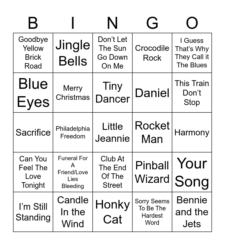 This bingo card has 29 words: I’m Still Standing, Sad Songs, Philadelphia Freedom, Bennie and the Jets, Goodbye Yellow Brick Road, Don’t Let The Sun Go Down On Me, Merry Christmas, Funeral For A Friend/Love Lies Bleeding, Rocket Man, Candle In the Wind, Harmony, Little Jeannie, Honky Cat, Sorry Seems To Be The Hardest Word, This Train Don’t Stop, Someone Saved My Life Tonight, Club At The End Of The Street, Can You Feel The Love Tonight, I Guess That’s Why They Call it The Blues, Sacrifice, Pinball Wizard, Levon, Daniel, Blue Eyes, Crocodile Rock, Jingle Bells, Your Song, Tiny Dancer and Saturday Night.