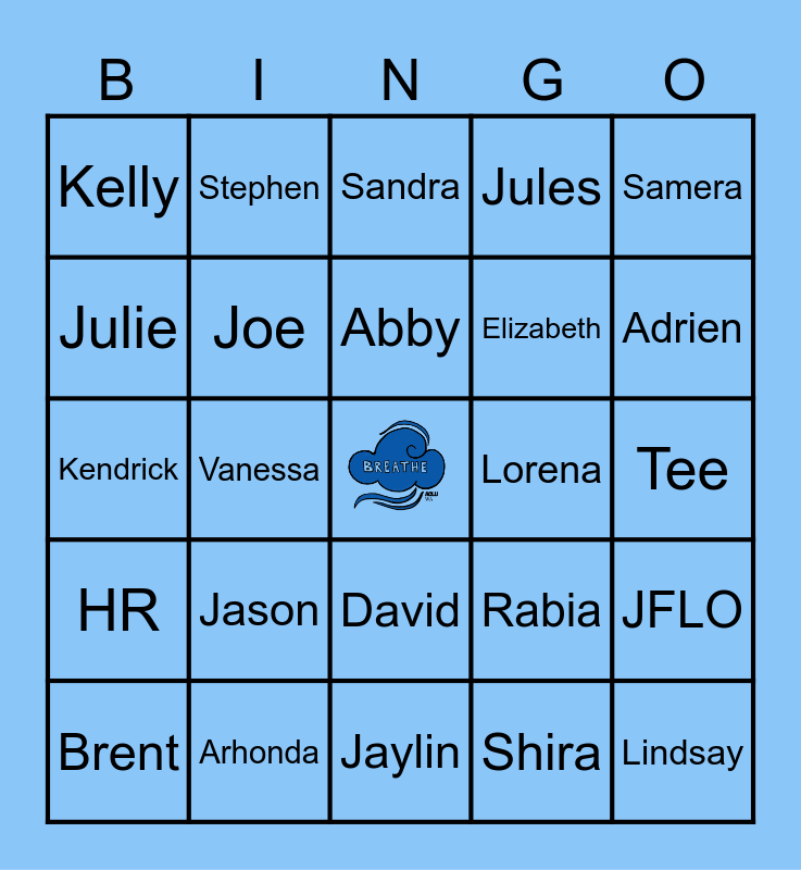 This bingo card has a free space and 48 words: Shareef, Lindsay, La Rond, Jaylin, Jason, Jazmyn, Stephen, Michael, Julie, Tonie, Joe, Jules, JFLO, Rabia, Andrea, Rachel, Abby, Lorena, Delcine, Samera, Vanessa, Shira, Kelly, Elizabeth, Marisa, Adrien, Brent, John M., David, HR, Chelsea, Sattie, Hannah, Molly, Arhonda, Jade, Brian, Tee, LaVendrick, Tiana, michele, Sophia, Sandra, Tara, Kendrick, Kaiyla, Tracie and Michelle.
