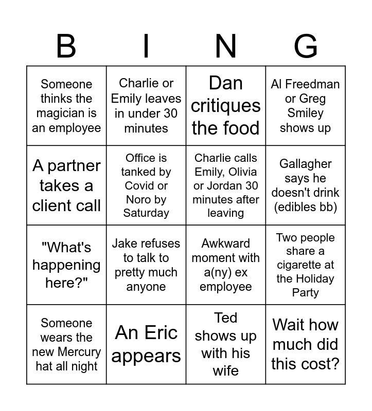 This bingo card has 16 words: An Eric appears, Two people share a cigarette at the Holiday Party, Dan critiques the food, Someone thinks the magician is an employee, "What's happening here?", Charlie or Emily leaves in under 30 minutes, Awkward moment with a(ny) ex employee, Ted shows up with his wife, A partner takes a client call, Office is tanked by Covid or Noro by Saturday, Someone wears the new Mercury hat all night, Al Freedman or Greg Smiley shows up, Jake refuses to talk to pretty much anyone, Gallagher says he doesn't drink (edibles bb), Charlie calls Emily, Olivia or Jordan 30 minutes after leaving and Wait how much did this cost?.