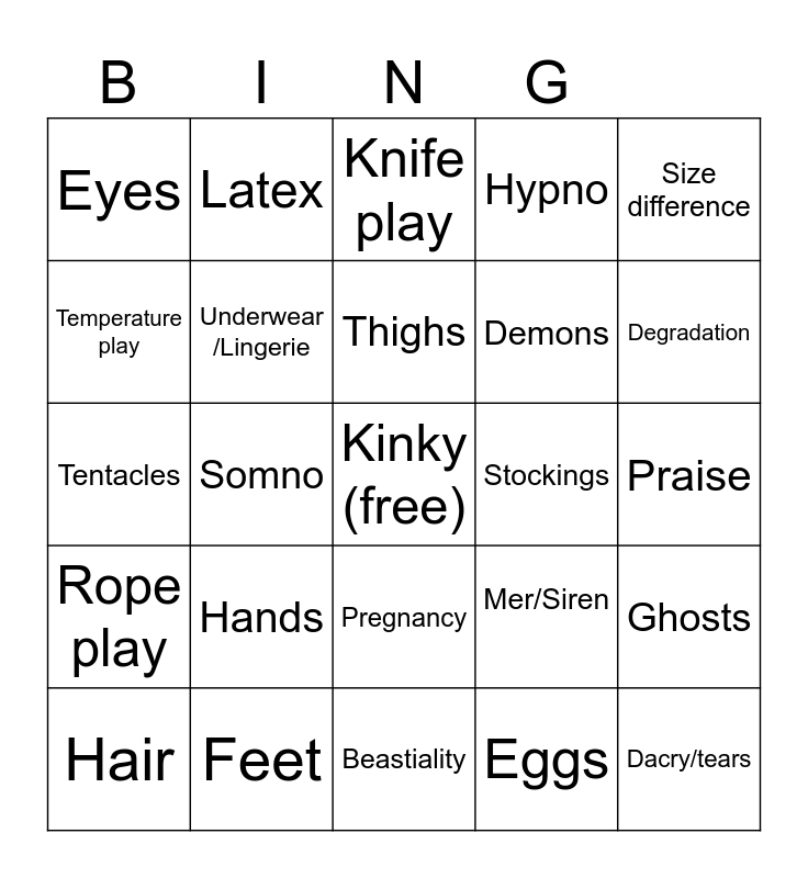 This bingo card has a free space and 24 words: Hands, Feet, Thighs, Hair, Size difference, Eyes, Temperature play, Latex, Stockings, Pregnancy, Demons, Tentacles, Mer/Siren, Ghosts, Underwear /Lingerie, Eggs, Praise, Knife play, Degradation, Somno, Dacry/tears, Rope play, Hypno and Beastiality.