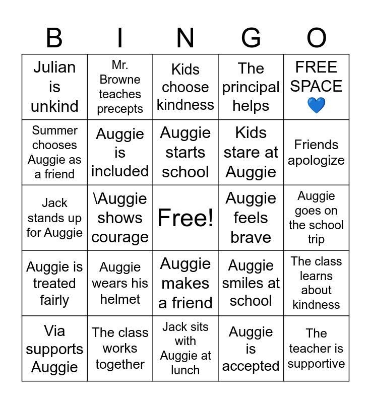 This bingo card has a free space and 25 words: Auggie wears his helmet, Jack sits with Auggie at lunch, Auggie starts school, Via supports Auggie, FREE SPACE 💙, Julian is unkind, Summer chooses Auggie as a friend, Mr. Browne teaches precepts, Auggie feels brave, Auggie makes a friend, Kids stare at Auggie, Jack stands up for Auggie, Auggie smiles at school, The class learns about kindness, Auggie is included, Via worries about Auggie, Auggie goes on the school trip, Kids choose kindness, Friends apologize, \Auggie shows courage, The teacher is supportive, The class works together, Auggie is treated fairly, The principal helps and Auggie is accepted.