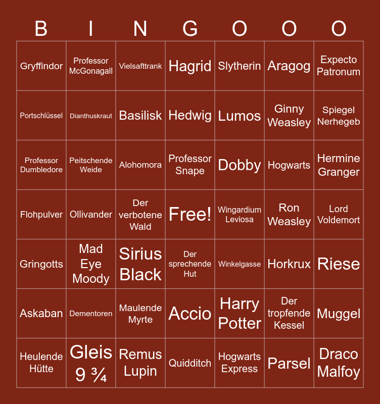 This bingo card has a free space and 48 words: Harry Potter, Ginny Weasley, Quidditch, Ollivander, Alohomora, Lord Voldemort, Professor McGonagall, Gleis 9 ¾, Aragog, Der sprechende Hut, Expecto Patronum, Hagrid, Hogwarts, Dobby, Askaban, Ron Weasley, Portschlüssel, Spiegel Nerhegeb, Der tropfende Kessel, Slytherin, Lumos, Der verbotene Wald, Gryffindor, Dianthuskraut, Muggel, Basilisk, Hermine Granger, Heulende Hütte, Professor Snape, Peitschende Weide, Parsel, Wingardium Leviosa, Riese, Dementoren, Flohpulver, Winkelgasse, Horkrux, Professor Dumbledore, Sirius Black, Maulende Myrte, Gringotts, Draco Malfoy, Vielsafttrank, Remus Lupin, Hedwig, Accio, Mad Eye Moody and Hogwarts Express.