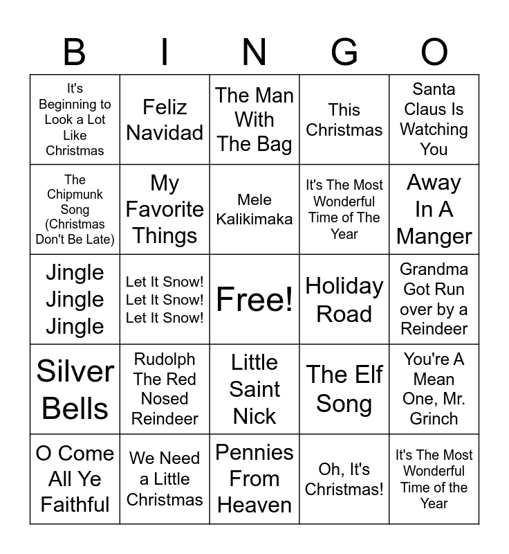 This bingo card has a free space and 64 words: Rockin' Around The Christmas Tree, All I Want for Christmas Is You, White Christmas, You're A Mean One, Mr. Grinch, 12 Days of Christmas, A Holly Jolly Christmas, Feliz Navidad, Blue Christmas, Mele Kalikimaka, God Rest Ye Merry Gentlemen/We Three Kings, Little Saint Nick, I Want a Hippopotamus for Christmas, Grandma Got Run over by a Reindeer, Santa Claus Is Watching You, Santa Looked a Lot Like Daddy, The Chipmunk Song (Christmas Don't Be Late), Let It Snow! Let It Snow! Let It Snow!, It's Beginning to Look a Lot Like Christmas, Jingle Bell Rock, It's The Most Wonderful Time of The Year, Rudolph The Red Nosed Reindeer, Silver Bells, This Christmas, Nuttin' For Christmas, Joy To The World, Hot Chocolate, Frosty The Snowman, Santa Claus Is Comin' to Town, Up On The House Top, Wonderful Christmastime, Santa Baby, This Christmas, Run Rudolph Run, Silent Night, Away In A Manger, O Come All Ye Faithful, Jingle Bells, Oh, It's Christmas!, Santa Got Stuck in the Chimney, My Favorite Things, Jingle Jingle Jingle, Holiday Road, December, 1963, December's Here, December, It's The Most Wonderful Time of the Year, We Need a Little Christmas, Go Tell It on the Mountain, The Elf Song, It Came Upon A Midnight Clear, Winter Wonderland, Christmas Time's A-Coming, Pennies From Heaven, 'Zat You, Santa Claus?, Deck The Halls, Wrap Me Up, The Man With The Bag, Mr. Big Stuff, December's Here, Jingle Jangle, Jing-a-Ling, Hurry Santa, Sweet Gingerbread Man and Elves Just Wanna Have Fun.