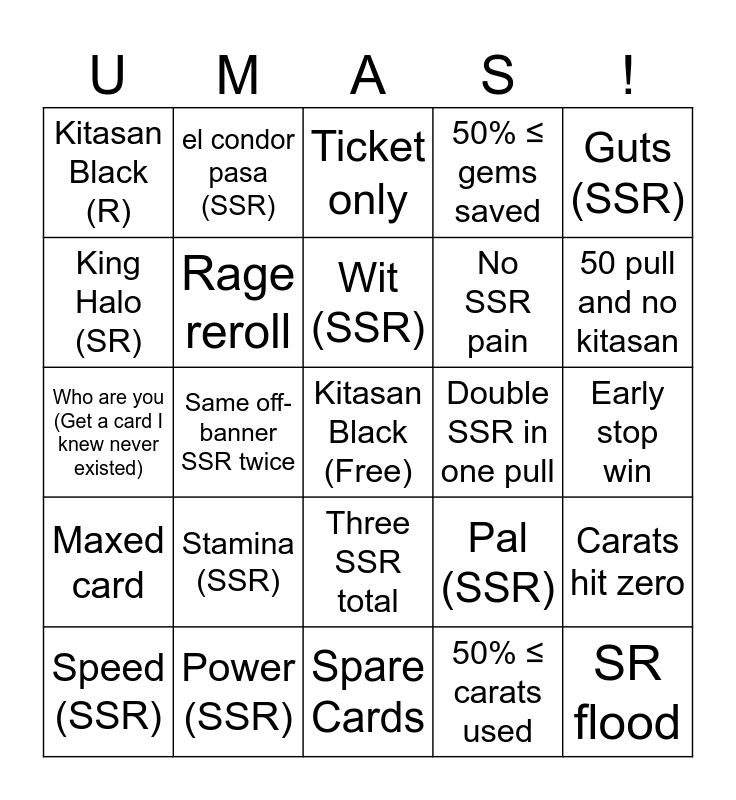 This bingo card has a free space and 24 words: Stamina (SSR), Power (SSR), Wit (SSR), Speed (SSR), Guts (SSR), Kitasan Black (R), King Halo (SR), el condor pasa (SSR), Double SSR in one pull, Three SSR total, No SSR pain, Who are you (Get a card I knew never existed), Pal (SSR), Carats hit zero, Rage reroll, 50% ≤ carats used, Early stop win, Ticket only, 50 pull and no kitasan, Same off-banner SSR twice, SR flood, Maxed card, 50% ≤ gems saved and Spare Cards.