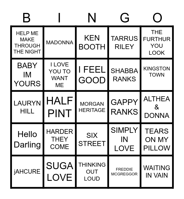 This bingo card has 29 words: Hello Darling, TWICE MY AGE, I FEEL GOOD, OVER YOU, THE FURTHUR YOU LOOK, HELP ME MAKE THROUGH THE NIGHT, I LOVE YOU TO WANT ME, SIX STREET, SIMPLY IN LOVE, WAITING IN VAIN, BABY IM YOURS, HALF PINT, MUSICAL YOUTH, FREDDIE MCGREGGOR, ALTHEA & DONNA, jAHCURE, HARDER THEY COME, MORGAN HERITAGE, TARRUS RILEY, TEARS ON MY PILLOW, LAURYN HILL, SUGA LOVE, KEN BOOTH, SHABBA RANKS, KINGSTON TOWN, MADONNA, THINKING OUT LOUD, GAPPY RANKS and I CANT WAIT.