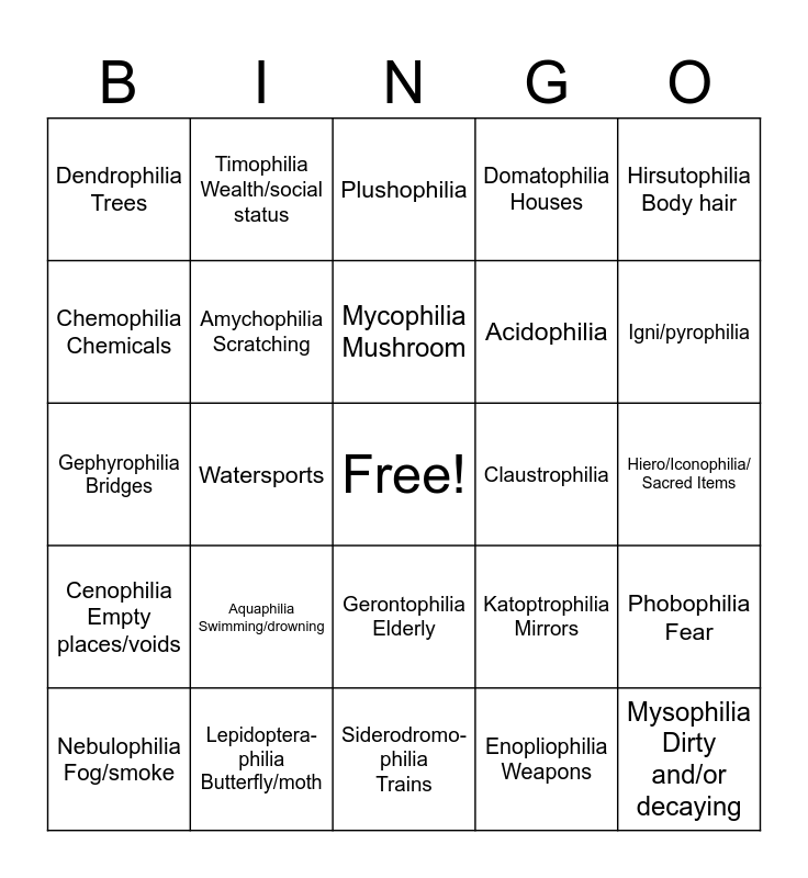 This bingo card has a free space and 31 words: Siderodromo-philia Trains, Coprophilia (Scat), Watersports, Formicophilia Insects, Dendrophilia Trees, Plushophilia, Amychophilia Scratching, Katoptrophilia Mirrors, Claustrophilia, Enopliophilia Weapons, Hiero/Iconophilia/ Sacred Items, Mysophilia Dirty and/or decaying, Erotophono-philia Murder, Forniphilia Human furniture, Igni/pyrophilia, Jelly fetishism, Phobophilia Fear, Aquaphilia Swimming/drowning, Cenophilia Empty places/voids, Gerontophilia Elderly, Hirsutophilia Body hair, Hybristophilia Cruel criminals, Nebulophilia Fog/smoke, Timophilia Wealth/social status, Acidophilia, Chemophilia Chemicals, Domatophilia Houses, Gephyrophilia Bridges, Lepidoptera-philia Butterfly/moth, Mycophilia Mushroom and Phobophilia Fear.
