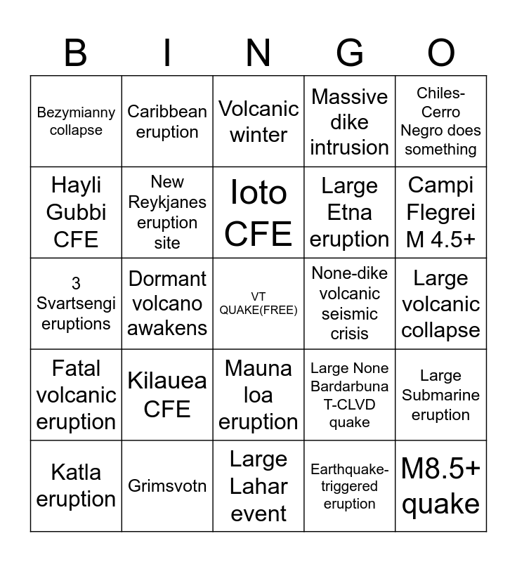 This bingo card has a free space and 24 words: Kilauea CFE, Grimsvotn, Ioto CFE, Katla eruption, Chiles-Cerro Negro does something, Bezymianny collapse, Hayli Gubbi CFE, Caribbean eruption, None-dike volcanic seismic crisis, Mauna loa eruption, Large Etna eruption, 3 Svartsengi eruptions, Large None Bardarbuna T-CLVD quake, Large Submarine eruption, New Reykjanes eruption site, Earthquake-triggered eruption, Large volcanic collapse, Volcanic winter, Campi Flegrei M 4.5+, Dormant volcano awakens, M8.5+ quake, Fatal volcanic eruption, Massive dike intrusion and Large Lahar event.