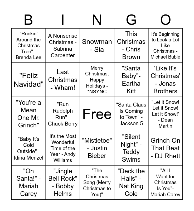 This bingo card has a free space and 29 words: "Oh Santa!" - Mariah Carey, "White Christmas" - The Drifters, "Run Rudolph Run" - Chuck Berry, "Holly Jolly Christmas" - Michael Bublé, "Rockin' Around the Christmas Tree" - Brenda Lee, Snowman - Sia, Last Christmas - Wham!, It's the Most Wonderful Time of the Year - Andy Williams, "Santa Claus Is Coming to Town" - Jackson 5, "Jingle Bell Rock" - Bobby Helms, "Let it Snow! Let it Snow! Let it Snow!' - Dean Martin, "All I Want for Christmas Is You"- Mariah Carey, "The Christmas Song (Merry Christmas to You)", "Deck the Halls" - Nat King Cole, 'Like It's Christmas' - Jonas Brothers, "Santa Tell Me' - Ariana Grande, "Mistletoe" - Justin Bieber, "Baby It's Cold Outside" - Idina Menzel, It's Beginning to Look a Lot Like Christmas - Michael Bublé, "You're a Mean One Mr. Grinch", "Silent Night" - Teddy Swims, "I Saw Mommy Kissing Santa Claus" - Jackson 5, "Santa Baby"- Eartha Kitt, "Feliz Navidad", This Christmas - Chris Brown, A Nonsense Christmas - Sabrina Carpenter, Grinch On That Beat - DJ Rhett, Merry Christmas, Happy Holidays - *NSYNC and 8 Days of Christmas - Destiny's Child.