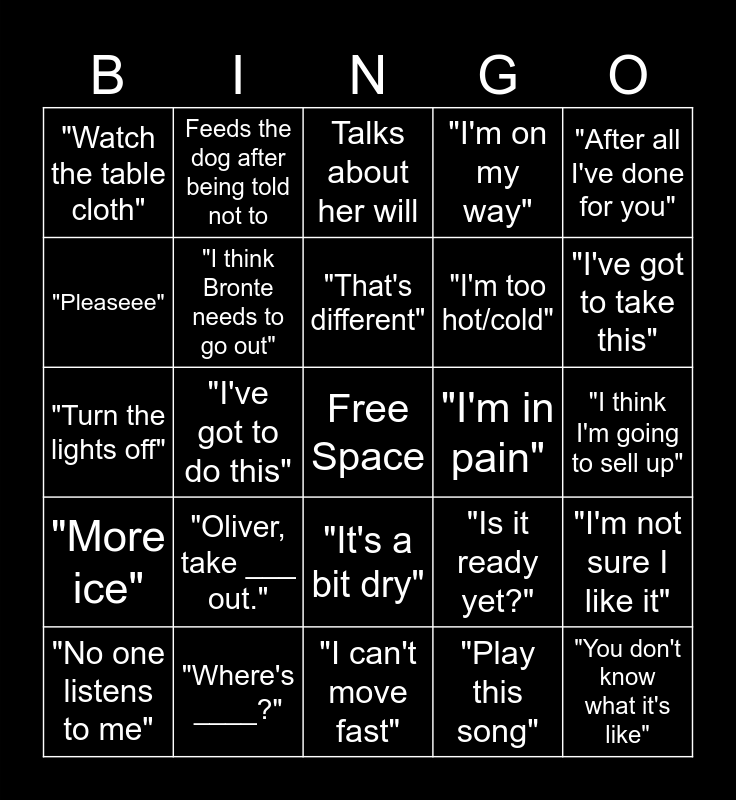 This bingo card has a free space and 24 words: "Oliver, take ___ out.", "Where's ____?", "That's different", "No one listens to me", "After all I've done for you", "Watch the table cloth", "Pleaseee", Feeds the dog after being told not to, "I'm in pain", "It's a bit dry", "I'm too hot/cold", "Turn the lights off", "Is it ready yet?", "I'm not sure I like it", "I think Bronte needs to go out", "Play this song", "I think I'm going to sell up", Talks about her will, "I've got to take this", "I've got to do this", "You don't know what it's like", "More ice", "I'm on my way" and "I can't move fast".