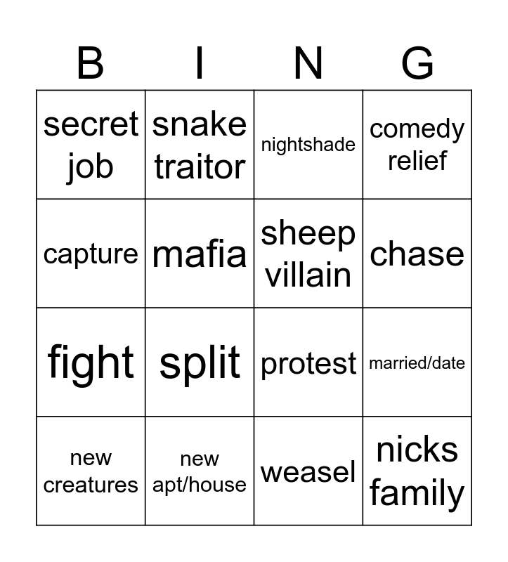 This bingo card has 16 words: new apt/house, married/date, nightshade, secret job, fight, snake traitor, protest, weasel, capture, mafia, new creatures, comedy relief, split, chase, sheep villain and nicks family.
