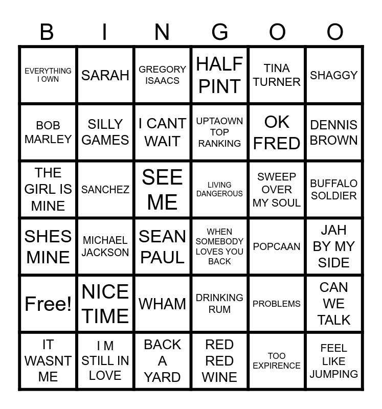 This bingo card has 42 words: SHES MINE, SANCHEZ, BARRINGTON LEVI, HALF PINT, SWEEP OVER MY SOUL, JAH BY MY SIDE, BOB MARLEY, ONE DANCE CAN DO, GREGORY ISAACS, UPTAOWN TOP RANKING, OK FRED, DENNIS BROWN, EVERYTHING I OWN, SILLY GAMES, BACK A YARD, LIVING DANGEROUS, TOO EXPIRENCE, BUFFALO SOLDIER, Free!, SARAH, I CANT WAIT, DRINKING RUM, POPCAAN, SHAGGY, IT WASNT ME, I M STILL IN LOVE, SEAN PAUL, MAXI PRIEST, PROBLEMS, FEEL LIKE JUMPING, MY BOY LOLIPOP, NICE TIME, SEE ME, WHEN SOMEBODY LOVES YOU BACK, LETS STAY TOGETHER, CAN WE TALK, THE GIRL IS MINE, MICHAEL JACKSON, WHAM, RED RED WINE, TINA TURNER and FRANKIE.