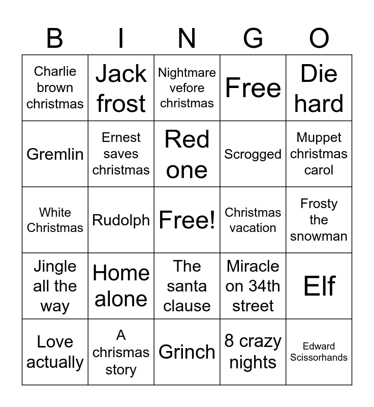 This bingo card has a free space and 25 words: Home alone, Grinch, Red one, Love actually, Die hard, Charlie brown christmas, Gremlin, Jack frost, Christmas vacation, The santa clause, Scrogged, White Christmas, Miracle on 34th street, Elf, Ernest saves christmas, It's a wonderful life, Frosty the snowman, Nightmare vefore christmas, Muppet christmas carol, Rudolph, Edward Scissorhands, A chrismas story, Jingle all the way, Free and 8 crazy nights.
