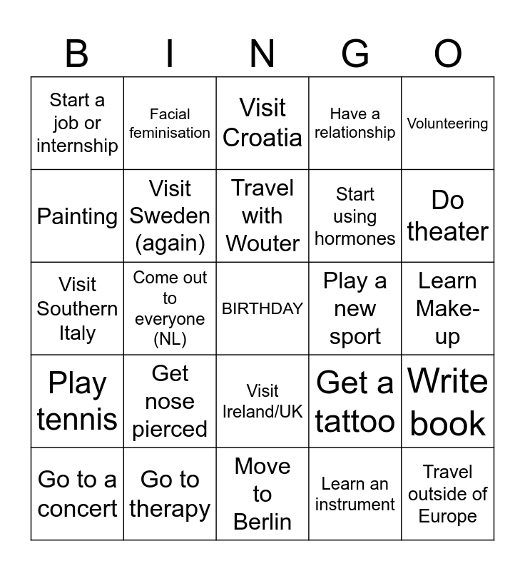This bingo card has a free space and 24 words: Get nose pierced, Go to therapy, Travel with Wouter, Go to a concert, Volunteering, Start a job or internship, Painting, Facial feminisation, Play a new sport, Visit Ireland/UK, Start using hormones, Visit Southern Italy, Get a tattoo, Write book, Visit Sweden (again), Learn an instrument, Learn Make-up, Visit Croatia, Do theater, Come out to everyone (NL), Travel outside of Europe, Play tennis, Have a relationship and Move to Berlin.