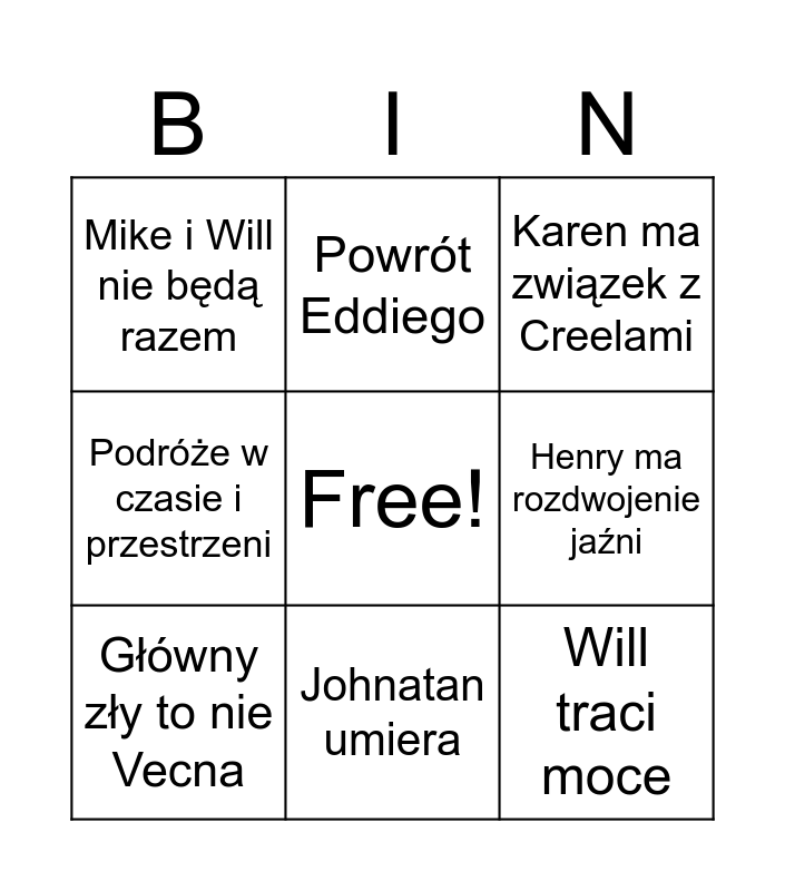 This bingo card has a free space and 8 words: Podróże w czasie i przestrzeni, Powrót Eddiego, Henry ma rozdwojenie jaźni, Główny zły to nie Vecna, Karen ma związek z Creelami, Mike i Will nie będą razem, Johnatan umiera and Will traci moce.