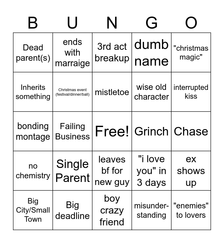 This bingo card has a free space and 29 words: Big City/Small Town, Santa cameo, Failing Business, Decorating Tree, Dead parent(s), 3rd act breakup, Christmas event (festival/dinner/ball), Single Parent, Grinch, Big deadline, Chase, "enemies" to lovers, boy crazy friend, misunder-standing, interrupted kiss, Snowball fight, leaves bf for new guy, no chemistry, "christmas magic", bonding montage, "i love you" in 3 days, Carolers, wise old character, Inherits something, dumb name, ends with marraige, ex shows up, mistletoe and hot chocolate.