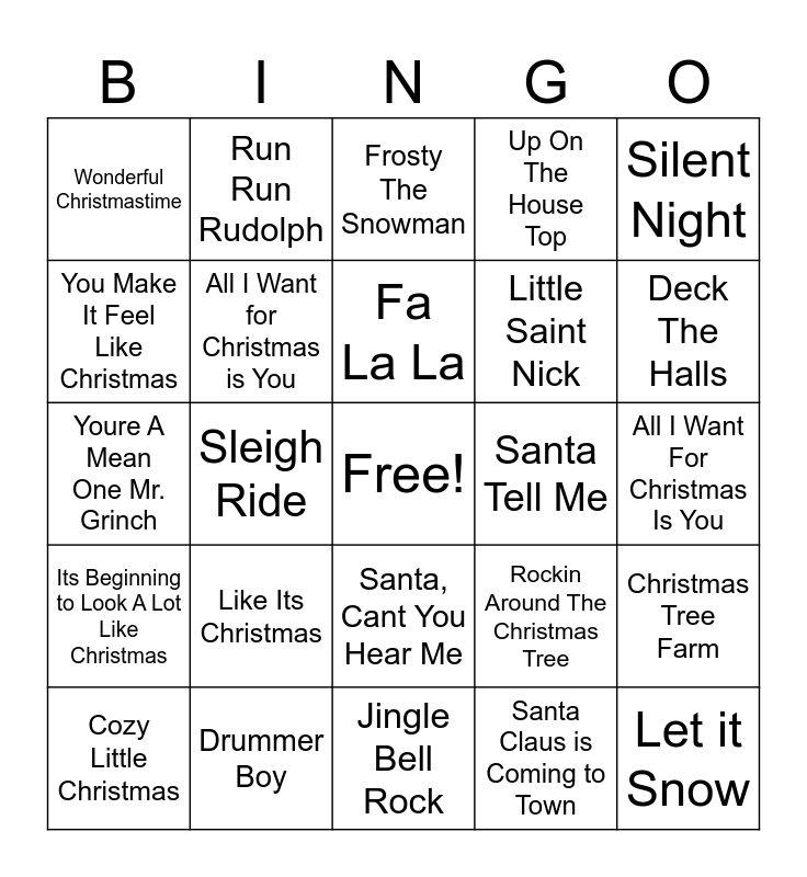 This bingo card has a free space and 26 words: Santa, Cant You Hear Me, Santa Claus is Coming to Town, Fa La La, Drummer Boy, Silent Night, Wonderful Christmastime, You Make It Feel Like Christmas, Run Run Rudolph, All I Want For Christmas Is You, Rockin Around The Christmas Tree, Little Saint Nick, Youre A Mean One Mr. Grinch, Christmas Tree Farm, Cozy Little Christmas, Sleigh Ride, Christmas, Up On The House Top, Its Beginning to Look A Lot Like Christmas, Frosty The Snowman, Let it Snow, Deck The Halls, Jingle Bell Rock, Santa Tell Me, Like Its Christmas, All I Want for Christmas is You and Feliz Navidad.