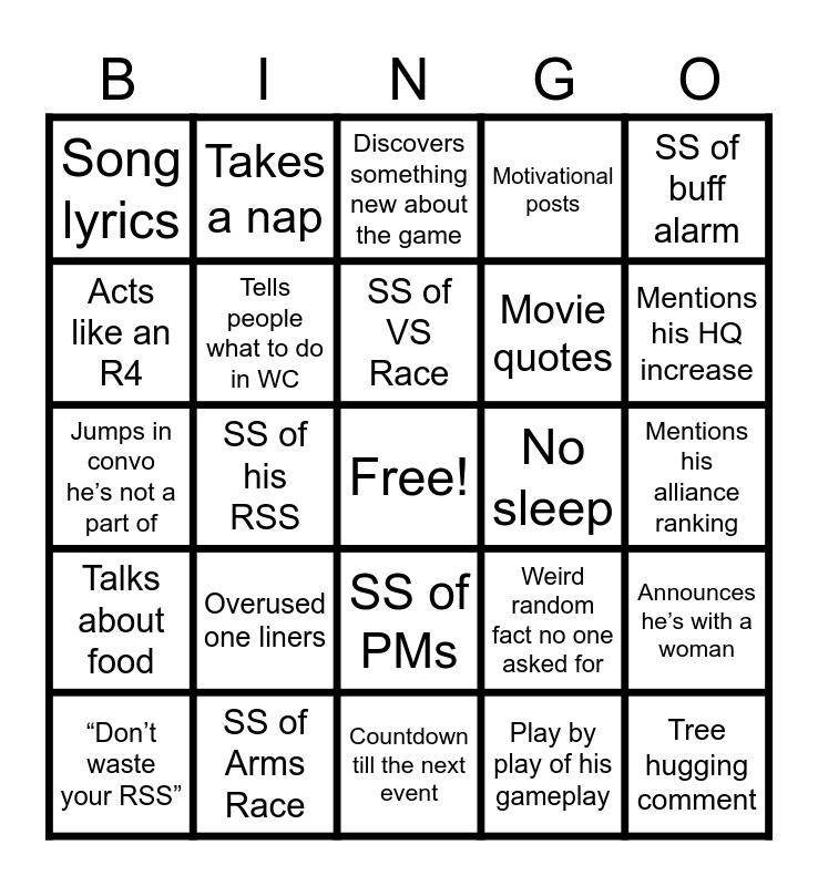 This bingo card has a free space and 24 words: Overused one liners, SS of Arms Race, SS of VS Race, “Don’t waste your RSS”, SS of buff alarm, Song lyrics, Acts like an R4, Takes a nap, No sleep, SS of PMs, Movie quotes, Jumps in convo he’s not a part of, Weird random fact no one asked for, Announces he’s with a woman, Tells people what to do in WC, Play by play of his gameplay, Mentions his alliance ranking, Discovers something new about the game, Mentions his HQ increase, SS of his RSS, Tree hugging comment, Talks about food, Motivational posts and Countdown till the next event.