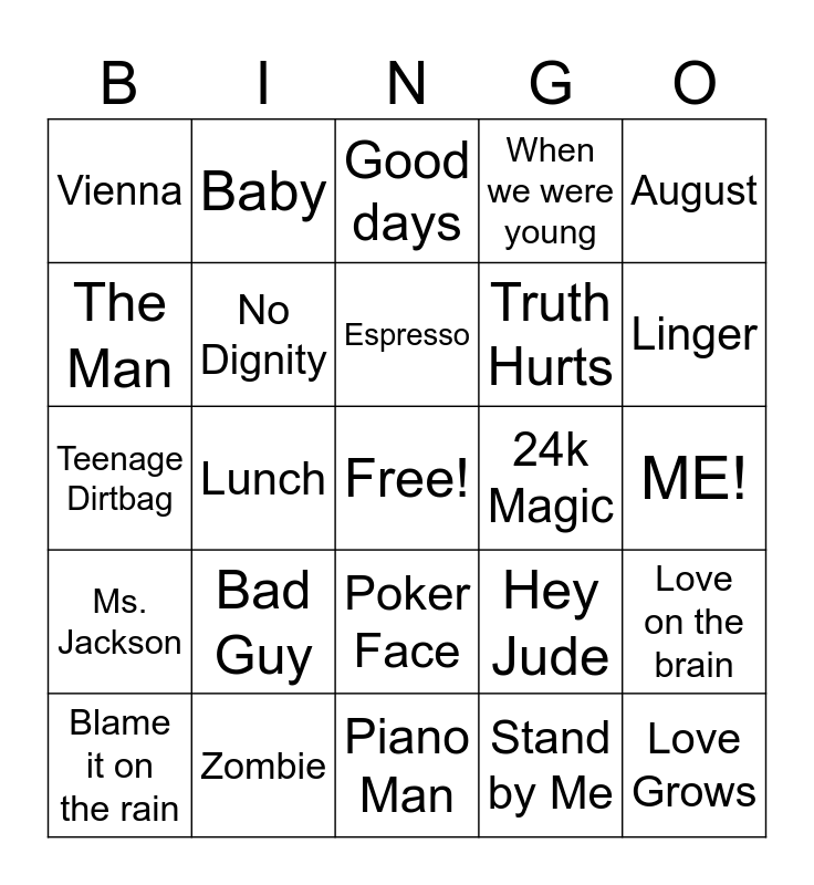 This bingo card has a free space and 57 words: Last goodbye, Blame it on the rain, Silver Springs, Vienna, Piano Man, Hopelessly Devoted to You, No Dignity, Timber, Truth Hurts, Love you like a love song, When we were young, Blurred lines, Bad romance, Hips don’t lie, American Pie, Back to Black, August, Lunch, Kiss me, Love Grows, 24k Magic, Thrift Shop, Hey Jude, Good days, Jolene, Espresso, You’re so vain, There’s a light that never goes out, Linger, I Bet You Think About Me, Lovers Rock, She Looks So Perfect, Kill Bill, Thank you for the music, ME!, The Man, Baby One More Time, Teenage Dirtbag, Fergalicious, Ms. Jackson, Baby, Poker Face, Disturbia, Call me maybe, Starships, Hey there Delilah, Bad Guy, Zombie, One last time, Cuz I love you, Super Freak, Stand by Me, Mamma Mia, Landslide, Bang Bang, Love on the brain and Girlfriend.