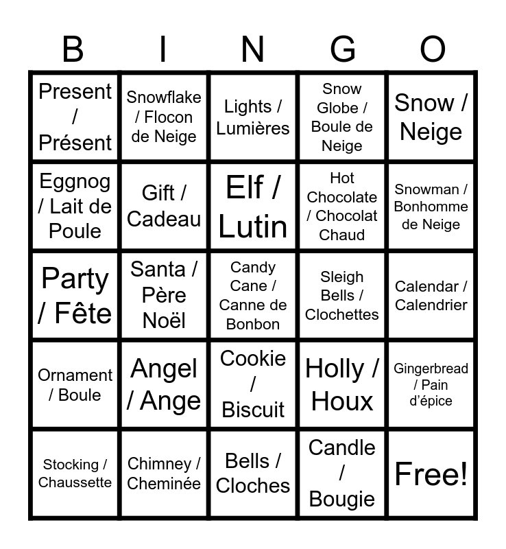 This bingo card has 33 words: Free!, Tree / Sapin, Santa / Père Noël, Reindeer / Renne, Ornament / Boule, Gift / Cadeau, Snow / Neige, Stocking / Chaussette, Snowflake / Flocon de Neige, Mistletoe / Gui, Elf / Lutin, Lights / Lumières, North Pole / Pôle Nord, Sleigh / Traineau, Sleigh Bells / Clochettes, Snowman / Bonhomme de Neige, Chimney / Cheminée, Party / Fête, Angel / Ange, Holly / Houx, Cookie / Biscuit, Wreath / Couronne, Present / Présent, Calendar / Calendrier, Bells / Cloches, Candy Cane / Canne de Bonbon, Snow Globe / Boule de Neige, Hot Chocolate / Chocolat Chaud, Eggnog / Lait de Poule, Gingerbread / Pain d’épice, Star / Étoile, Candle / Bougie and Fireplace / Cheminée.