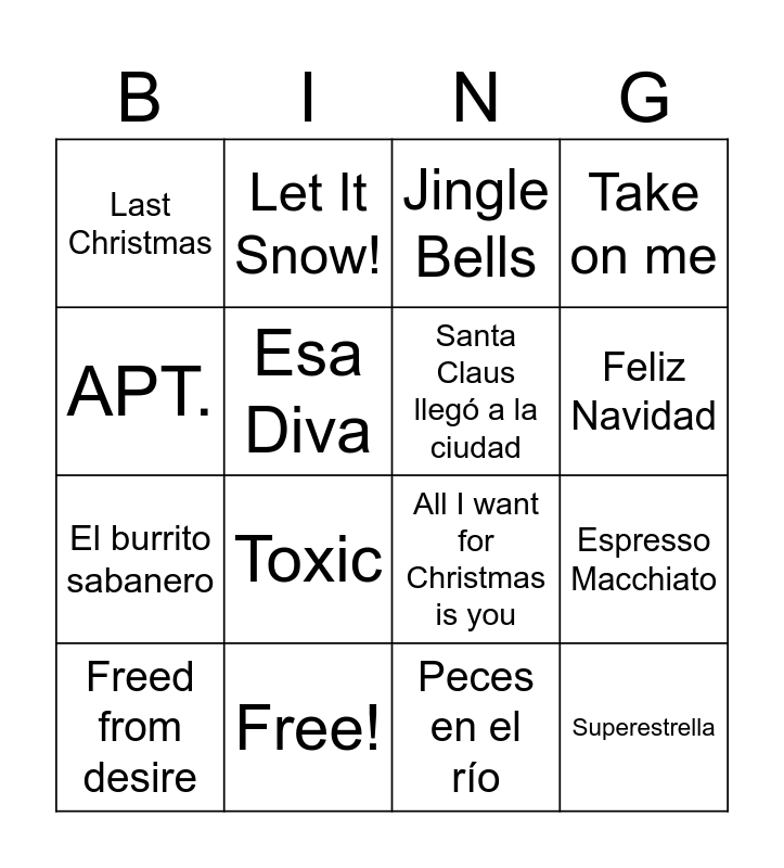 This bingo card has 21 words: Free!, Sleigh Ride, Let It Snow!, White Christmas, Peces en el río, Santa Claus llegó a la ciudad, Last Christmas, Jingle Bells, All I want for Christmas is you, Feliz Navidad, El burrito sabanero, Take on me, Superestrella, Golden, Esa Diva, Abracadabra, Freed from desire, Toxic, APT., Espresso Macchiato and Dancing Queen.