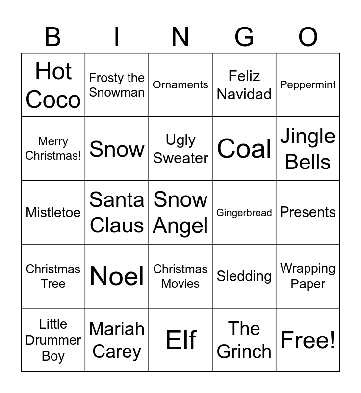 This bingo card has 33 words: Free!, Rudolph, Santa Claus, Cookies, Christmas Tree, Snow, Peppermint, Little Drummer Boy, Frosty the Snowman, Santa's Sleigh, Ugly Sweater, Ornaments, Elf on The Shelf, Fa La La La La, Gingerbread, Jingle Bells, Mariah Carey, Mistletoe, Noel, Sledding, Christmas Movies, Toys, Hot Coco, Presents, Elf, Snow Angel, Feliz Navidad, Coal, Merry Christmas!, Wrapping Paper, Candy Canes, The Grinch and Jesus Birth.