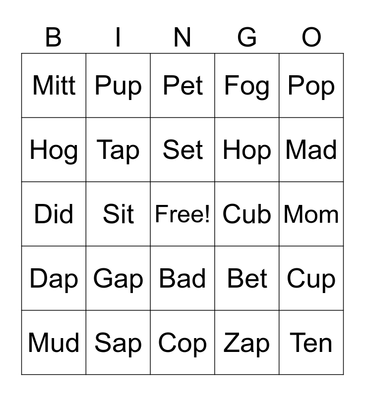 This bingo card has a free space and 24 words: Gap, Sap, Set, Mud, Pop, Mitt, Hog, Pup, Cub, Bad, Hop, Did, Bet, Cup, Tap, Zap, Mom, Pet, Mad, Sit, Ten, Dap, Fog and Cop.