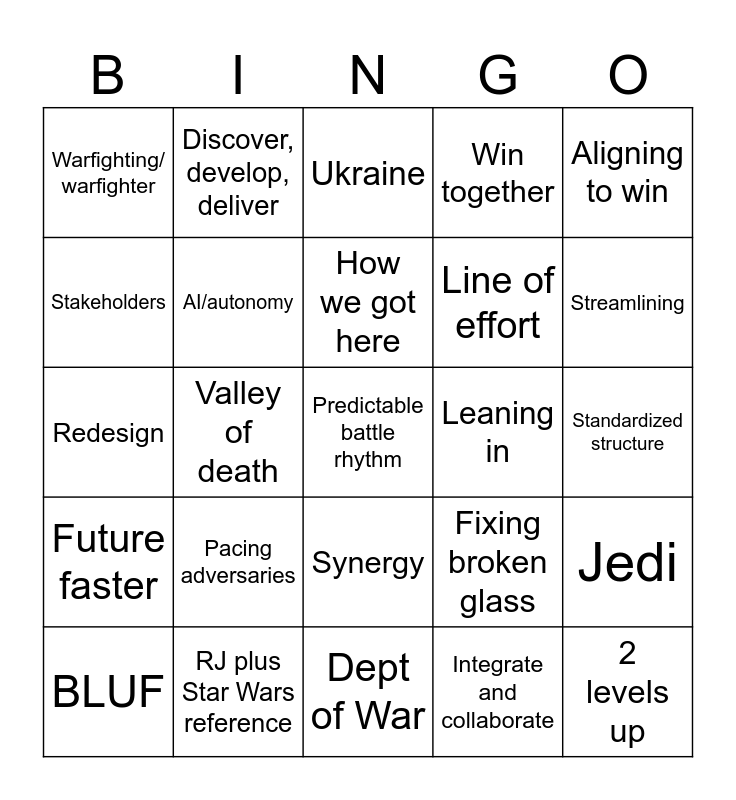 This bingo card has 25 words: Pacing adversaries, Dept of War, How we got here, BLUF, Aligning to win, Warfighting/ warfighter, Stakeholders, Discover, develop, deliver, Leaning in, Synergy, Line of effort, Redesign, Fixing broken glass, Jedi, AI/autonomy, 2 levels up, Standardized structure, Ukraine, Streamlining, Valley of death, Predictable battle rhythm, RJ plus Star Wars reference, Future faster, Win together and Integrate and collaborate.