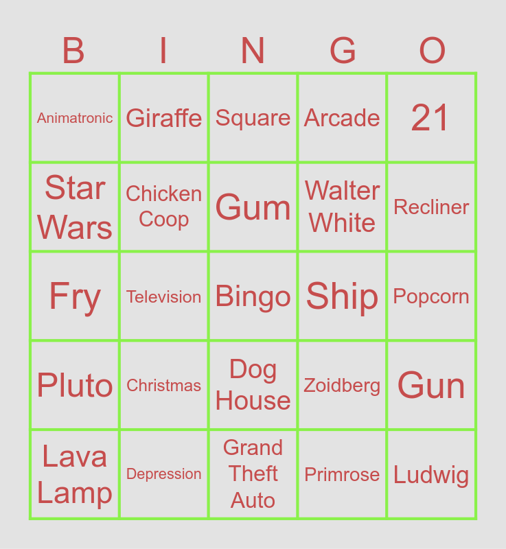 This bingo card has a free space and 24 words: Christmas, Depression, Gum, Lava Lamp, 21, Animatronic, Star Wars, Giraffe, Ship, Dog House, Walter White, Fry, Zoidberg, Gun, Chicken Coop, Primrose, Popcorn, Square, Recliner, Television, Ludwig, Pluto, Arcade and Grand Theft Auto.