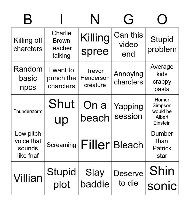 This bingo card has a free space and 24 words: Screaming, Stupid plot, Trevor Henderson creature, Villian, Stupid problem, Killing off charcters, Random basic npcs, Charlie Brown teacher talking, Yapping session, Filler, Annoying charcters, Thunderstorm, Bleach, Dumber than Patrick star, I want to punch the charcters, Deserve to die, Homer Simpson would be Albert Einstein, Killing spree, Average kids crappy pasta, Shut up, Shin sonic, Low pitch voice that sounds like fnaf, Can this video end and Slay baddie.
