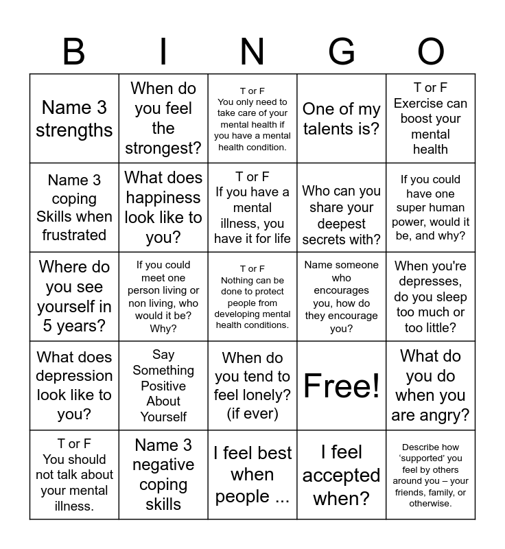 This bingo card has 25 words: Say Something Positive About Yourself, I feel best when people ..., T or F If you have a mental illness, you have it for life, T or F You should not talk about your mental illness., T or F Exercise can boost your mental health, Name 3 strengths, Name 3 coping Skills when frustrated, When do you feel the strongest?, Name someone who encourages you, how do they encourage you?, When do you tend to feel lonely? (if ever), Who can you share your deepest secrets with?, Where do you see yourself in 5 years?, Free!, What do you do when you are angry?, What does happiness look like to you?, Describe how ‘supported’ you feel by others around you – your friends, family, or otherwise., When you're depresses, do you sleep too much or too little?, T or F You only need to take care of your mental health if you have a mental health condition., If you could have one super human power, would it be, and why?, If you could meet one person living or non living, who would it be? Why?, T or F Nothing can be done to protect people from developing mental health conditions., Name 3 negative coping skills, What does depression look like to you?, One of my talents is? and I feel accepted when?.